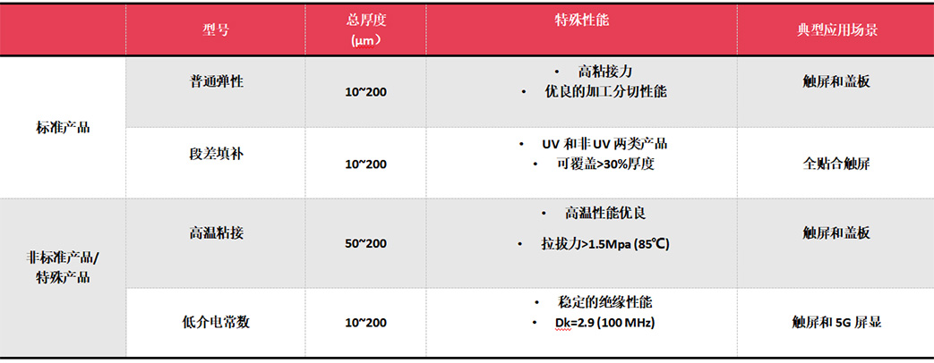 应用阐述:LCD触屏显示模组中G+G, G+F, G+FF等材料的粘接,LCD显示器面板各类光学膜片的背胶粘接